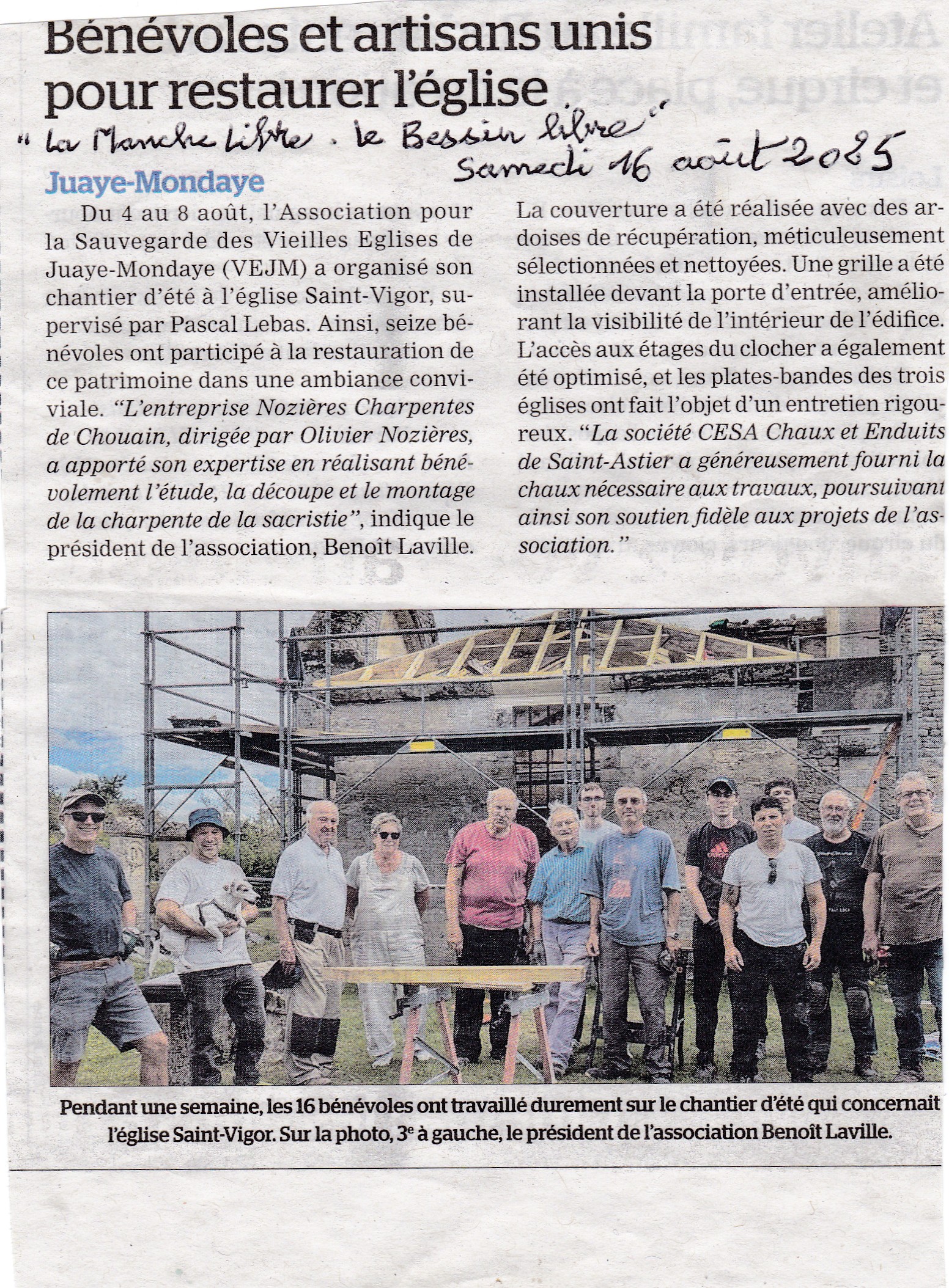 Bénévoles et artisans unis pour restaurer l’église Au cœur de Juaye-Mondaye, l’été 2008 a été marqué par une mobilisation exemplaire : bénévoles, artisans et amoureux du patrimoine se sont unis pour redonner vie à l’église Saint-Vigor. ← Actualités de Juillet Actualités du mois d’Août →