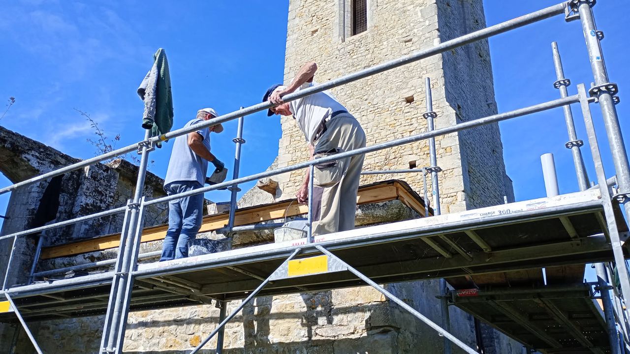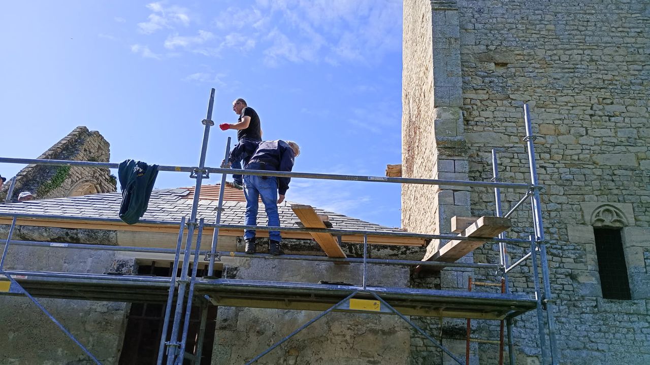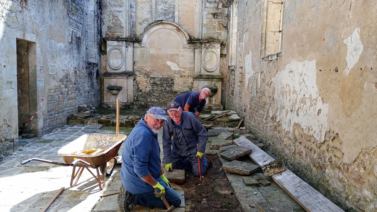Deuxième mardi du mois, après un grand nettoyage (désherbage) de la nef de Saint Vigor, reprise des travaux de dallage du chœur qui avancent à grande vitesse (photo 2). La couverture de la sacristie avance plus lentement, la pose des biaises étant plus difficile (photo 3 et 4).